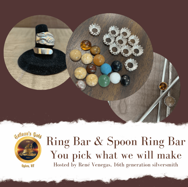 Rene will be offering his drop in ring bar. Stop by and pick out parts for a unique custom made ring. First pick out a stone, size of ring, then the bezel (metal that holds the stone), and then pick your silver band style. OR choose from a wide variety of spoon handles for a custom spoon ring.